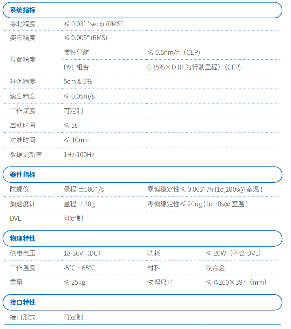 F990SD 是一款自主研發的精度高一體式耐壓光纖慣性導航系統,可實現 0.03°的自尋北, DVL 組合導航精度可達 0.15 %*D。